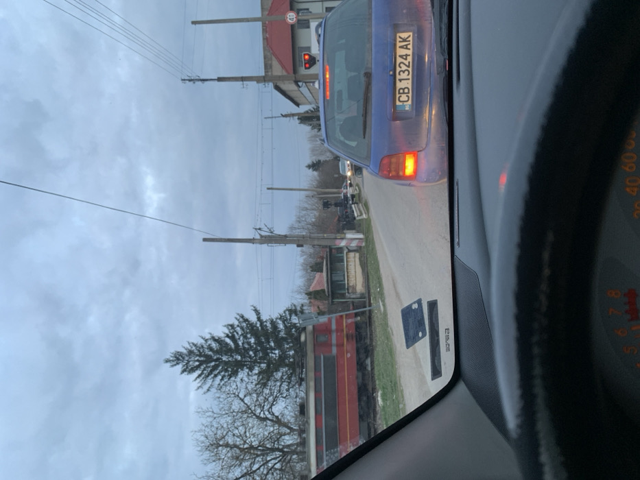 The image provides a frontal view from inside a stationary vehicle, with the black steering wheel and a portion of the dashboard visible in the foreground. The scene depicts a railway level crossing in Gromshin, Bulgaria, under an overcast sky. Ahead, a blue Audi station wagon with Bulgarian license plate CB 1324 AK is stopped on a paved road, its left brake light illuminated. Further down the road, additional vehicles are visible in a queue. To the right of the road, a red traffic light, likely for the railway crossing, is illuminated. A building with a red roof and a white circular speed limit sign displaying "40" are also present on the right. Multiple utility poles with overhead lines traverse the scene. To the left of the road, a red and white electric locomotive is visible on railway tracks, positioned parallel to the road. A small, light green rectangular building is situated near the tracks. In the background to the left, bare deciduous trees and a tall evergreen tree are visible. A sticker is affixed to the inside of the windshield in the upper foreground.