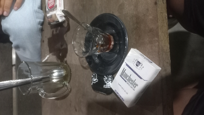 A forensic close-up view depicts a worn wooden table at an establishment in Muliengmanyang, Indonesia. On the left, a clear glass mug contains two silver spoons and a residue of greenish liquid at its base. Adjacent to the mug, a dark brown liquid is spilled directly onto the wooden surface. A person's lap, clad in light blue denim jeans, is partially visible in the upper right background. In the lower left foreground, a sealed white pack of 'Manchester' cigarettes with purple branding is positioned. Next to it, a small black item with white detailing, possibly a pouch, rests on the table. Centrally, a small clear glass cup containing a dark reddish-brown liquid and a silver spoon is placed on a black saucer. An open red and white 'Lucky Strike' cigarette pack is partially visible in the far upper right. The lower foreground shows the dark-clad legs of an individual, indicating a seated perspective.