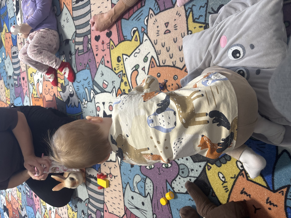 A child lies prone on a colorful cat-themed rug, partially covered by a stuffed animal. Beside them, an adult sits with a small rabbit toy. Another child, wearing patterned pants and red socks, stands nearby. A gray elephant-shaped pillow rests on the rug. Scattered around are small wooden blocks. An arm reaches into the frame at the top.
