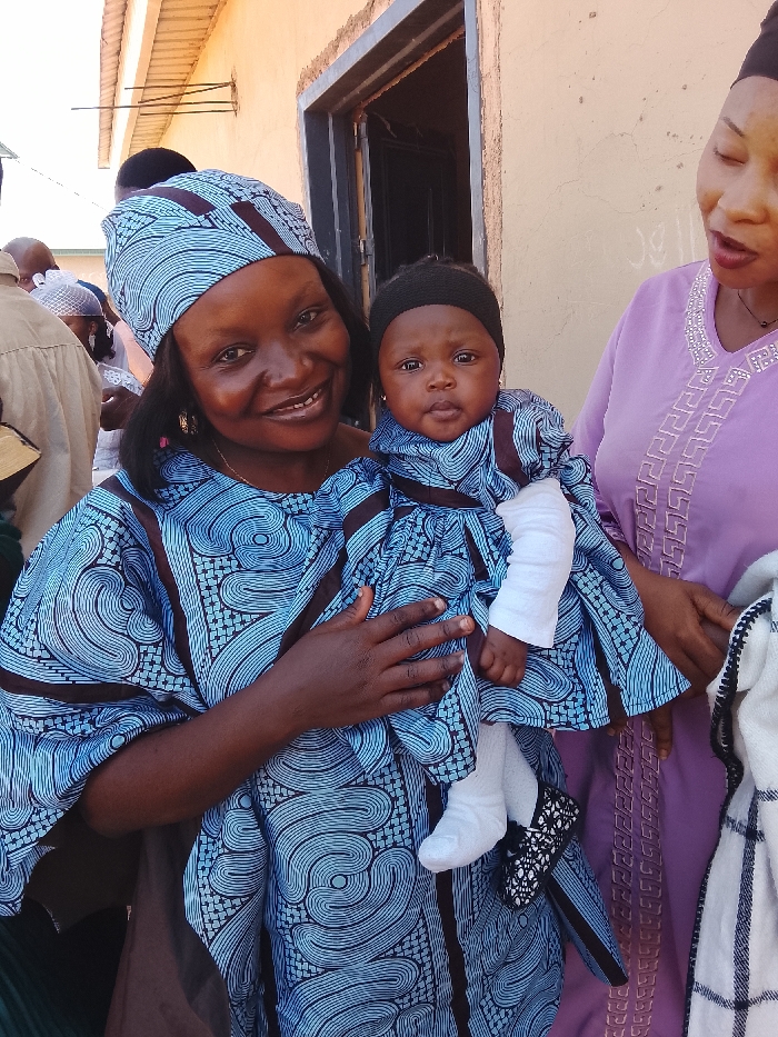 The scene takes place outdoors in Gwafan, Nigeria. A woman with dark skin and a direct, smiling expression is positioned centrally, holding an infant. She wears a light blue and dark brown patterned headwrap and a matching long-sleeved dress featuring abstract swirls and geometric patterns. Her hands support the infant. The infant, also with dark skin, wears a matching light blue and dark brown patterned dress, a black knitted head wrap, a white long-sleeved undershirt, white footed tights, and black and white patterned mary-jane style shoes. The infant's gaze is directed forward. To the right of the central figures, a second woman with dark skin is partially visible, wearing a lavender-colored dress adorned with white or silver embellishments along the neckline and front. Her right hand is positioned near the infant's left leg. In the blurred background to the left, several other individuals are present, including one person holding what appears to be a book. The immediate background consists of a light-colored, possibly stucco, building wall with visible texture and minor discolorations. A dark, open rectangular frame, consistent with a doorway or window, is visible behind the woman and infant. A roofline or building edge is present in the upper background. The entire scene is illuminated by bright, natural daylight.