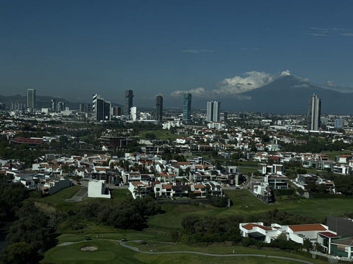 An aerial view captures a modern urban landscape in Puebla City, Mexico, under a clear blue sky with scattered white clouds. The foreground features a manicured green golf course with fairways, a sand trap, and two golf carts. Above the golf course, the midground is dominated by a residential area composed of numerous modern, multi-story houses, primarily with white facades and reddish-brown tiled roofs, interspersed with green spaces and winding roads. In the background, a dense cityscape with numerous high-rise buildings and skyscrapers of varying architectural styles extends across the horizon. Beyond the city and mountains, the prominent Popocatépetl volcano rises, its summit partially obscured by white clouds. The scene is brightly illuminated by natural daylight. No distinct human figures are visible, only the golf carts suggest potential activity.