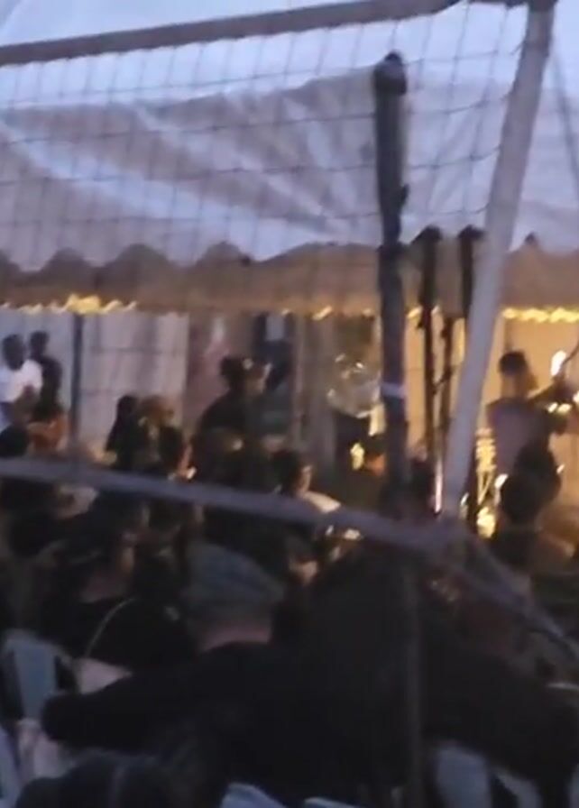A crowd of people is seated in chairs under a white tent. At the far end of the tent, a person is speaking into a microphone on a stand. Another person is recording the speaker with a camera. Some people in the crowd are also holding up their phones to record. There is a volleyball net in the foreground. It appears to be evening or nighttime.