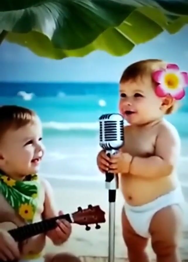 The scene displays two infants on a beach, one holding a microphone stand while wearing a flower in their hair and the other playing a ukulele and wearing a floral-patterned scarf