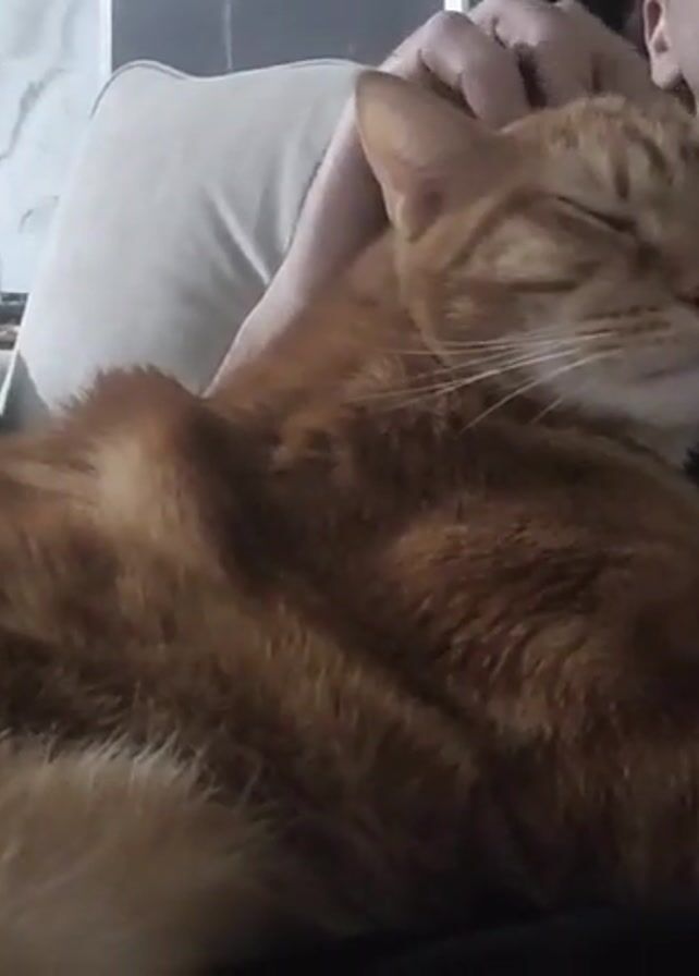 A man is sitting down and petting an orange tabby cat. The man is wearing a black shirt, and the cat is lying on his lap with its eyes closed. The background includes a green pillow, a white cushion, some kitchen cabinets, and an air conditioning unit. The man's hand is visible petting the cat's head.
