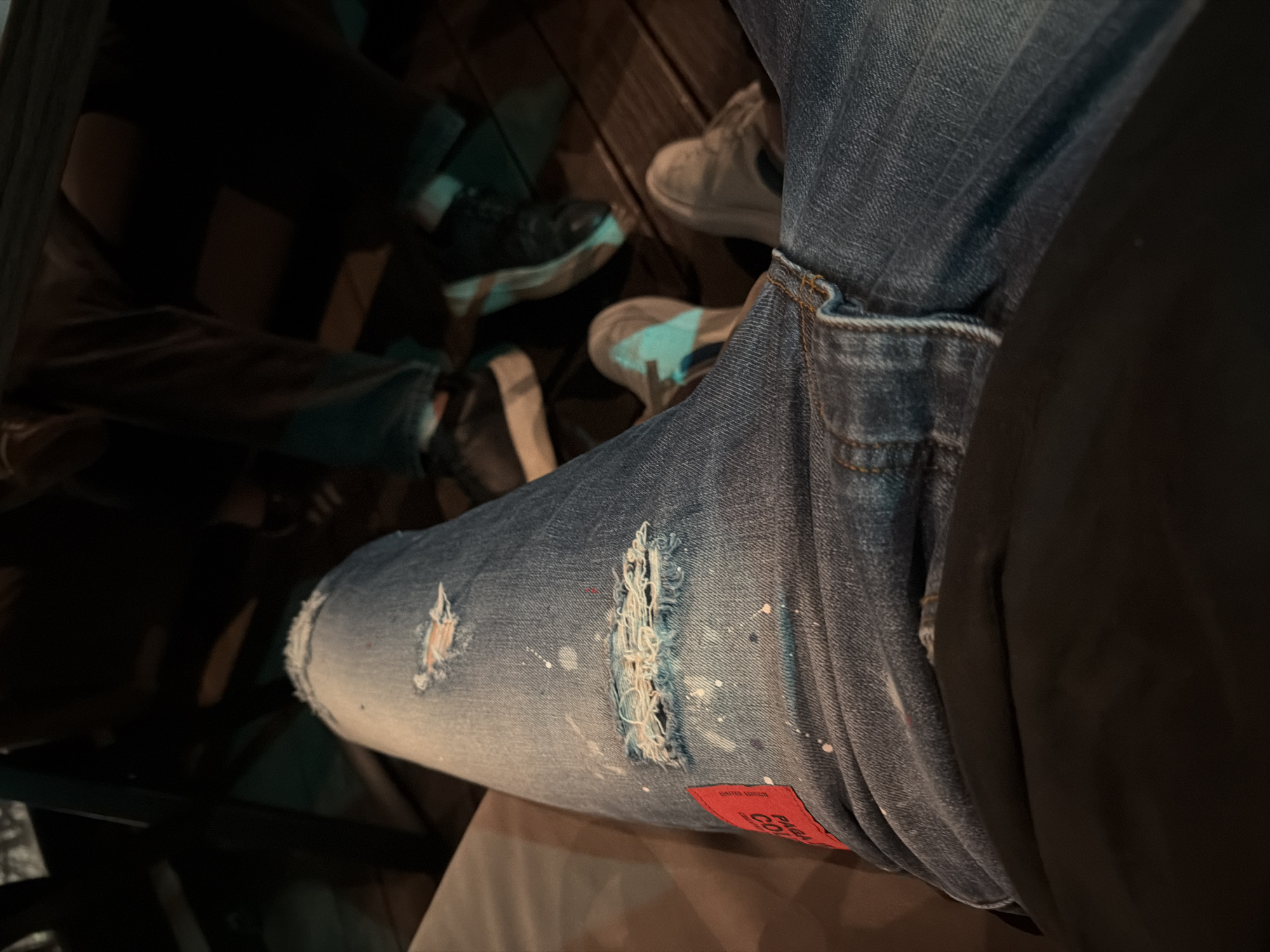 The image displays a first-person, downward-looking perspective in a dimly lit environment within Sofia, Bulgaria. In the immediate foreground, the upper leg of an individual is visible, dressed in blue denim jeans. These jeans are distinctly distressed, featuring two prominent horizontal rips on the thigh/knee area with exposed white threads, along with scattered white and faint red paint splatters across the fabric. A rectangular red fabric patch, partially legible as "PARA[DISE] COL[LECTION]" and "LIMITED EDITION," is stitched onto the outer left thigh. Beyond the foreground subject, the lower legs and feet of at least two other individuals are discernible, seated or positioned nearby. One person wears dark trousers and dark, possibly black, footwear. Another individual is seen wearing lighter-colored sneakers that exhibit a distinct light blue/teal luminescence on their sides, likely due to ambient lighting conditions. The floor beneath the subjects is composed of dark, horizontal wooden planks or decking. The overall scene suggests an informal gathering in a low-light setting, such as a cafe, bar, or restaurant. No specific actions or interactions are clearly depicted beyond the static presence of multiple individuals.