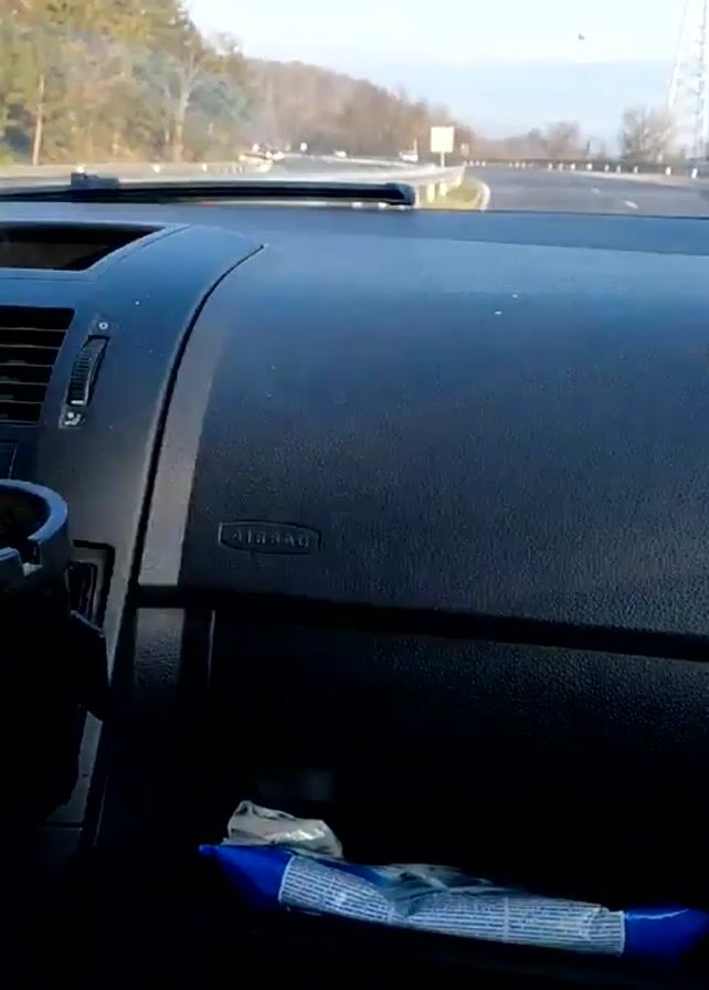 A static shot from inside a vehicle moving along a road, likely a highway, shows the dashboard and windshield view