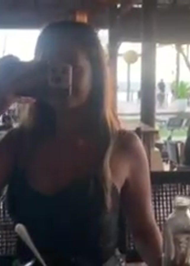 A woman is sitting at a table in a restaurant and taking a selfie with her phone. The restaurant appears to be an open-air establishment with a view of the ocean. Other patrons can be seen in the background, dining and walking around. The woman is wearing a black top and has long hair. The restaurant has a wooden structure with woven furniture.
