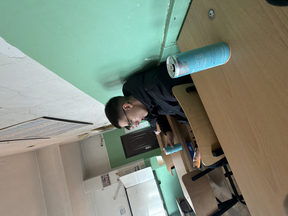 An indoor photograph captures a classroom scene within an educational institution in Sofia, Bulgaria. In the immediate foreground, an open, light blue Red Bull "ICE EDITION" energy drink can rests on a light-colored wooden desk. To the left, a male with short, dark hair and eyeglasses is seated at an adjacent wooden desk, wearing a black puffer jacket. He holds a light blue cylindrical object (possibly a thermos or can) in his left hand, and his mouth is slightly open, directing his gaze downward and to the right. A smartphone with an illuminated screen lies flat on his desk. Partially visible behind him, a second male in a dark jacket is also seated at a desk. The classroom features a two-tone wall design: the lower section is painted light green, while the upper section and ceiling are off-white, exhibiting visible cracking and peeling paint. Posters and charts, including one with numerical grids and another with an image of a car, are affixed to the upper wall. A dark brown door with a silver handle is visible in the background, above which a black security camera (CCTV) is mounted. A whiteboard is partially visible on the far left wall. Natural light illuminates the scene from the left.