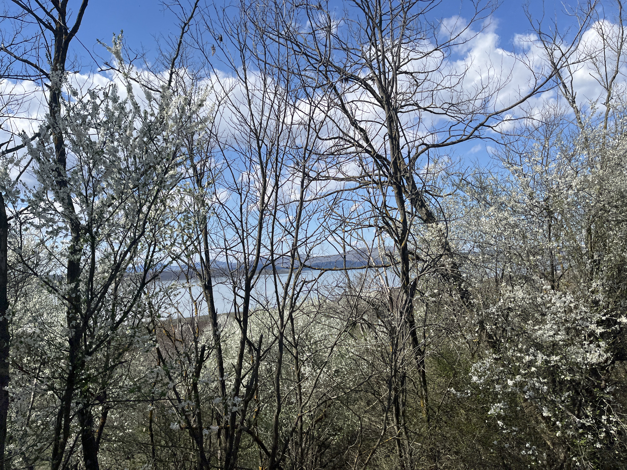 The image depicts a scene of flowering trees against a backdrop of blue sky and clouds. The trees are densely packed, with some displaying bare branches and others covered in white blossoms. In the distance, a body of water can be seen. The location is Blagovo, Bulgaria.