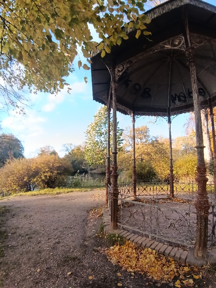 An octagonal cast-iron gazebo, exhibiting a dark, rusted surface and ornate metalwork, dominates the right side of the image. The underside of its roof displays black spray-painted graffiti, including the words "KOB" and "moko". The gazebo's base is constructed from bricks, and its interior floor is covered with scattered yellow autumn leaves. To the left, a dirt path curves, also strewn with numerous fallen yellow leaves. Beyond the path, dense deciduous trees and shrubs with yellow and orange autumn foliage extend towards a visible body of water in the mid-left background. Overhead, tree branches with yellow-green leaves partially frame a blue sky containing scattered white clouds. No human or animal subjects are present. This scene is located at the Schwanenteich-Pavillon (or Music Pavilion at Schwanenteich) in the Ferdinands Aue park, adjacent to the Schwanenteich (Swan Pond), in Leipzig, Germany.