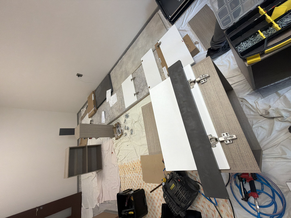 The image displays an interior room in Burgas, Bulgaria, undergoing furniture assembly
