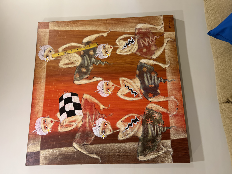 A square painting features an orangish-brown gradient background. Six stylized figures are depicted, with unique headdresses and outfits. One figure plays a yellow flute, another has a headdress resembling a black and white checkerboard. Several figures have black zigzag patterns on their chests. The painting’s border is brown and gold. A blue pillow and beige couch are visible on the right edge.