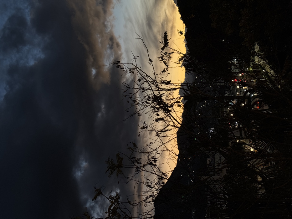 The image depicts a dramatic sky contrasting dark, stormy clouds on the left with a bright, yellow-orange sunset glow on the right. Silhouetted branches and a dark, mountainous landscape with faint city lights punctuate the skyline. The composition is vertically oriented, emphasizing the towering presence of the storm clouds and the transition from daylight to night.