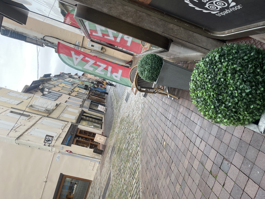 The image displays an angled view of Rue Julien, a cobblestone street in Le Puy-en-Velay, France, under an overcast sky. In the immediate foreground on the right, two faux green topiary balls in grey rectangular planters are visible, partially obscuring a black sign with a white TripAdvisor logo. Adjacent to these are two red and green vertically striped flags displaying "PIZZA" in white capital letters, with one flag's reflection visible in a nearby window. Two light-brown wicker chairs are positioned around a small outdoor table next to the flags. The street surface transitions from brown square pavers to irregular grey cobblestones, showing damp patches, and slopes gently downward. On the left, a light-colored historic building features a "Rue Julien" street sign, a red circular "No Entry" sign, and the dark storefront of "A l'Chocolat," identifiable by its name and a prominent € symbol sign. An A-frame sign stands outside this shop. Further down the narrow street, a series of multi-story buildings with various shops and residential windows line both sides. One individual, wearing a yellow top, is observed walking away in the distance on the right side of the street.