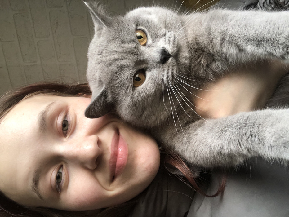 A medium-close portrait features a female subject partially visible on the left, smiling subtly, with light skin and brown hair displaying a reddish streak, looking towards the camera. She is holding a grey cat, a British Shorthair type, centrally positioned with amber eyes and prominent white whiskers, looking directly forward with a neutral expression. The cat's body is held upright by the female, whose hand is partially visible beneath the cat's chest. The background consists of a light-colored, textured wall resembling white brick. The scene is illuminated by ambient light. This image is situated in Фоки, Russia.