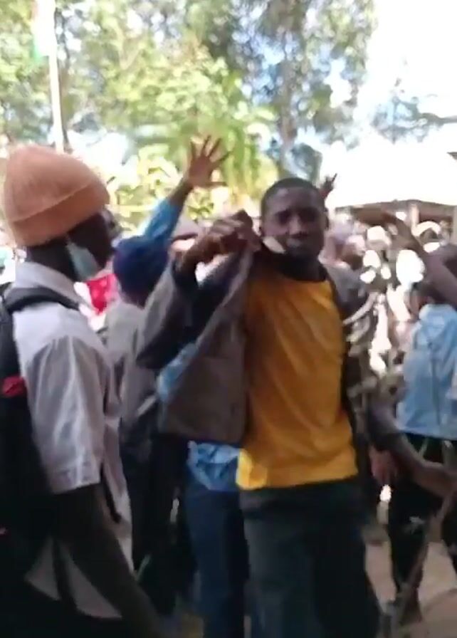 A crowd of people gathers outdoors. The majority of individuals are male. They are dressed in a mix of casual clothes, including t-shirts, jackets, and hats. A person in a yellow shirt and gray jacket gestures expressively with their hands. The crowd appears lively and agitated, some shouting. The background includes trees and some visible structures, giving the impression of an outdoor area, possibly a market or public space.