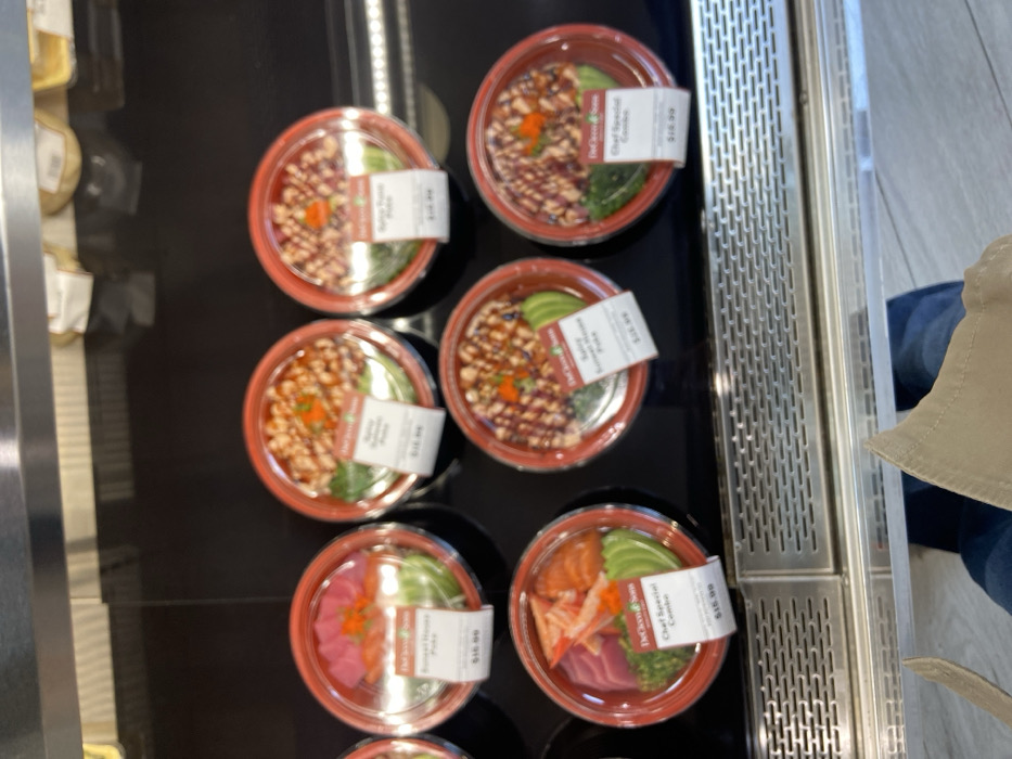 Six red, plastic containers with clear lids display various sushi bowls with fresh fish, vegetables, and rice. The bowls are arranged in a row. Each bowl has a small white price tag attached with the name of the bowl printed on it. The bowls are sitting on a stainless-steel countertop. Behind the counter, a person's legs are visible. The location of the image is in Harrison, New York, at latitude 40.962 and longitude -73.723.