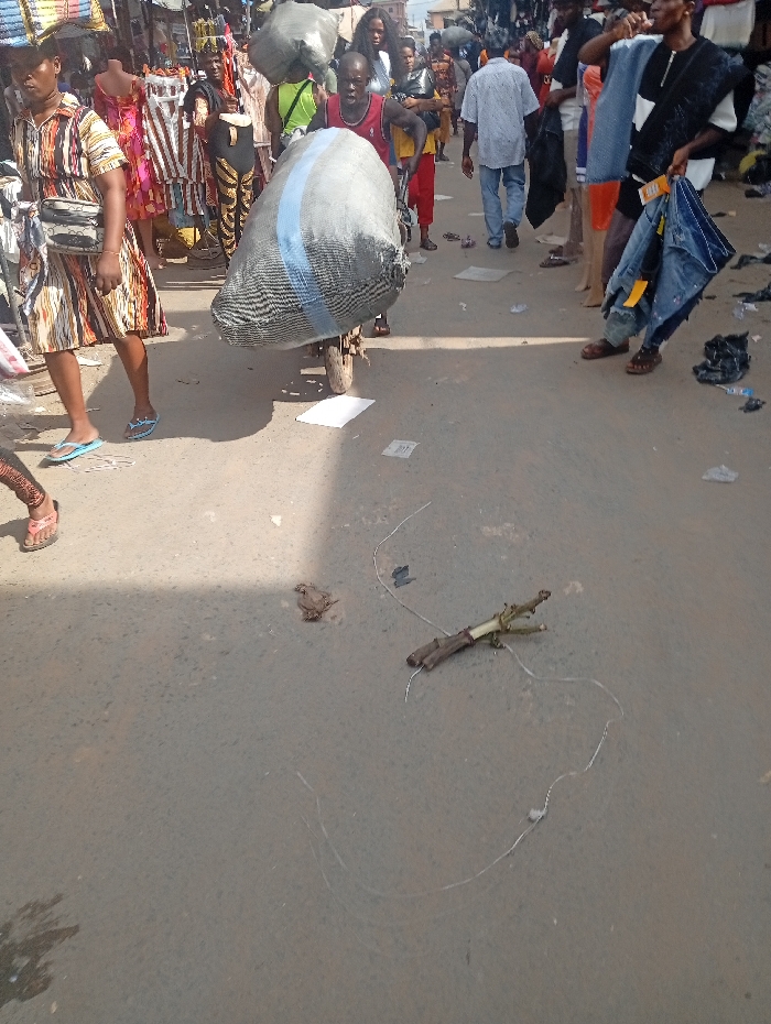 The image depicts a busy outdoor market street in Fegge, Nigeria, under daylight conditions. The paved asphalt surface in the foreground is littered with debris, including several white papers, black plastic bags, a small brown organic mass, and a short segment of a woody plant stem with thin white wire or string extending onto the ground. In the left foreground, a female subject walks from left to right, wearing a multicolored patterned midi-dress, a beige and black shoulder bag, and light blue flip-flops. Her lower left leg and foot are partially visible in the bottom left corner. Centrally, a male subject pushes a wooden wheelbarrow overloaded with a large, light grey, possibly mesh, sack featuring a horizontal blue stripe. He wears a red tank top and dark shorts. On the right side of the mid-ground, a male subject, wearing a black and white tunic over dark shorts and brown sandals, holds multiple denim garments, including what appears to be two pairs of jeans. The background is populated with numerous individuals walking, some carrying items on their heads. On the far left, market stalls display various brightly colored garments on hangers and mannequins. Architectural structures are visible further down the street. The scene is illuminated by strong sunlight, casting distinct shadows.