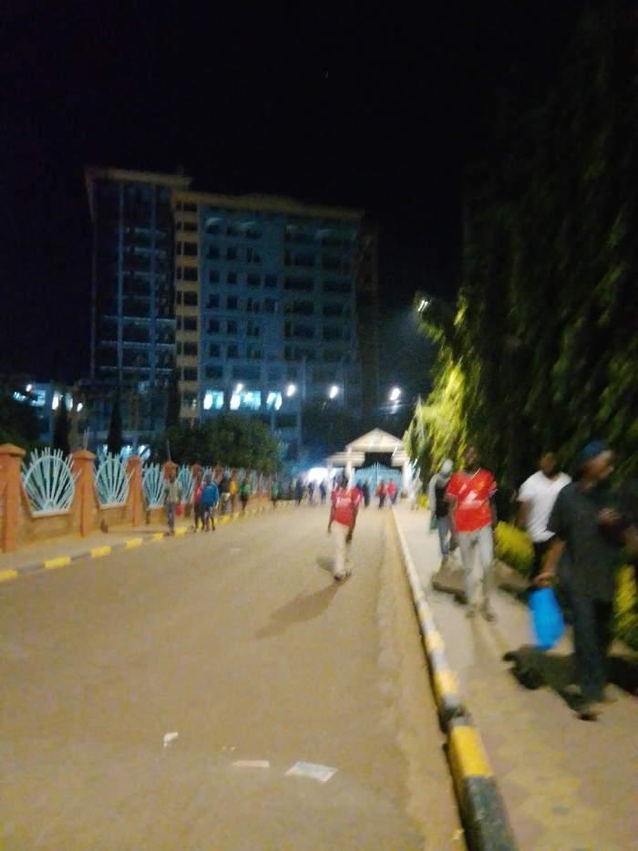 At night, a slightly blurred image shows a street scene with numerous people. A tall building with illuminated windows dominates the left background. People are walking along the sides of the road, some wearing red shirts. Trees line one side of the street. Streetlights cast a warm glow, illuminating the road surface and sidewalks. A gate is visible in the center distance. The overall scene suggests a public gathering or event.