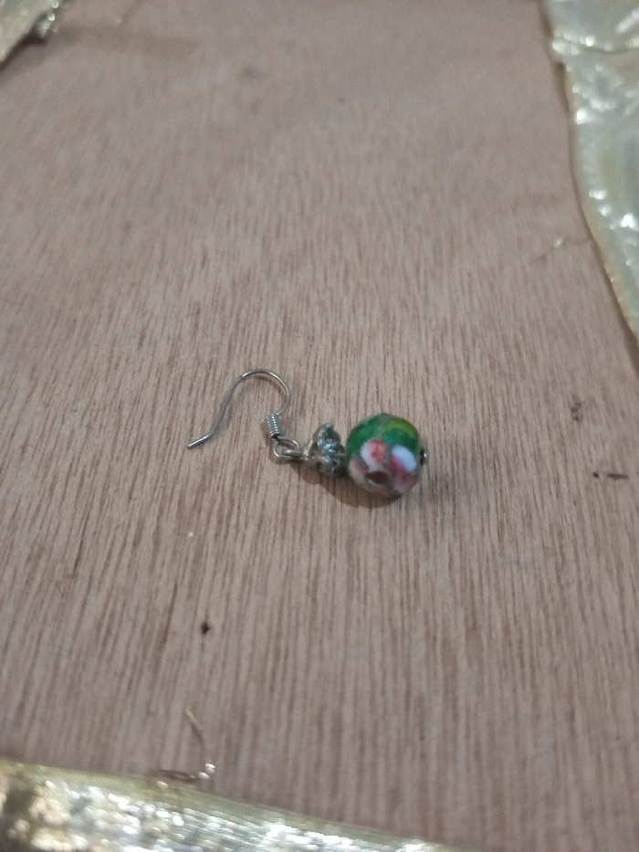 A single earring is depicted lying on a light brown wooden surface with visible vertical grain lines. The earring consists of a silver-colored wire hook component attached to a spherical bead. The bead is approximately 8-10mm in diameter, primarily green, featuring red and white floral or abstract patterns. The silver-colored components show minor signs of wear or tarnish. The earring is positioned slightly off-center to the right. Out-of-focus, reflective, possibly metallic or fabric elements are visible along the top and bottom edges of the frame. The scene is located in Chandragiri, Nepal.