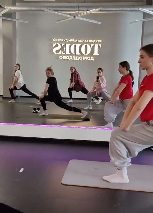 group of six people in what appears to be a dance or fitness studio. They are performing a stretching routine facing a large mirror that reflects their movements. The mirror has the word "TODES" written in large letters. Most of the individuals are doing lunges, some with their hands on their knees for balance. One person seems to be taking a photo with their phone, and another appears to be modifying the lunge. The person filming is also participating in the exercise, doing a squat. All are wearing casual clothing, such as t-shirts and sweatpants. The studio has a sleek, modern design with a dark floor, a bright, white wall, and fluorescent lighting. The floor is partially covered with grey yoga mats. The lighting in the mirror glows with a purple light.