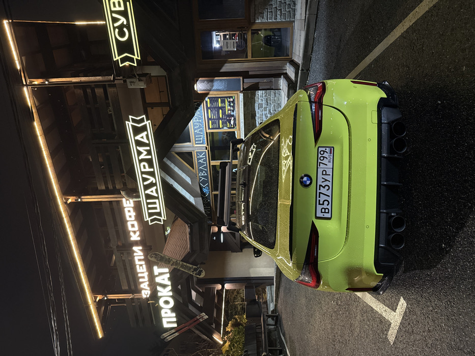A bright yellow BMW is parked beside a building at night. Raindrops cover the car's surface. The building features illuminated signs in Cyrillic for "SHAURMA", "COFFEE", and "RENT". Snowboards and skis adorn the side of the building. The car's license plate is visible, with the Russian flag in the corner, and the BMW logo is centered above the license plate. The car has four exhaust pipes.