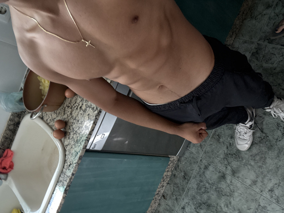 The image depicts a male subject in a kitchen located in Burjassot, Spain. The subject is visible from mid-thigh to just above the collarbone, shirtless, revealing a muscular torso and a linear surgical scar on the lower abdomen. He wears dark blue sweatpants with a visible drawstring and white athletic shoes with black accents. A golden chain with a cross pendant hangs around his neck. The kitchen features a speckled light green and grey granite countertop, a white ceramic sink with a red cloth inside, and teal-colored base cabinets. A silver-grey "Teka" brand dishwasher is integrated under the countertop. On the countertop, a copper-colored pot contains diced potatoes, and three brown eggs are situated nearby. A light blue plastic bag is partially visible behind the pot. The floor is tiled with square, grey-green marbled tiles.