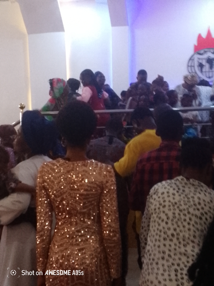 The image depicts an indoor gathering within what appears to be a church or large hall in Adankolo, Nigeria