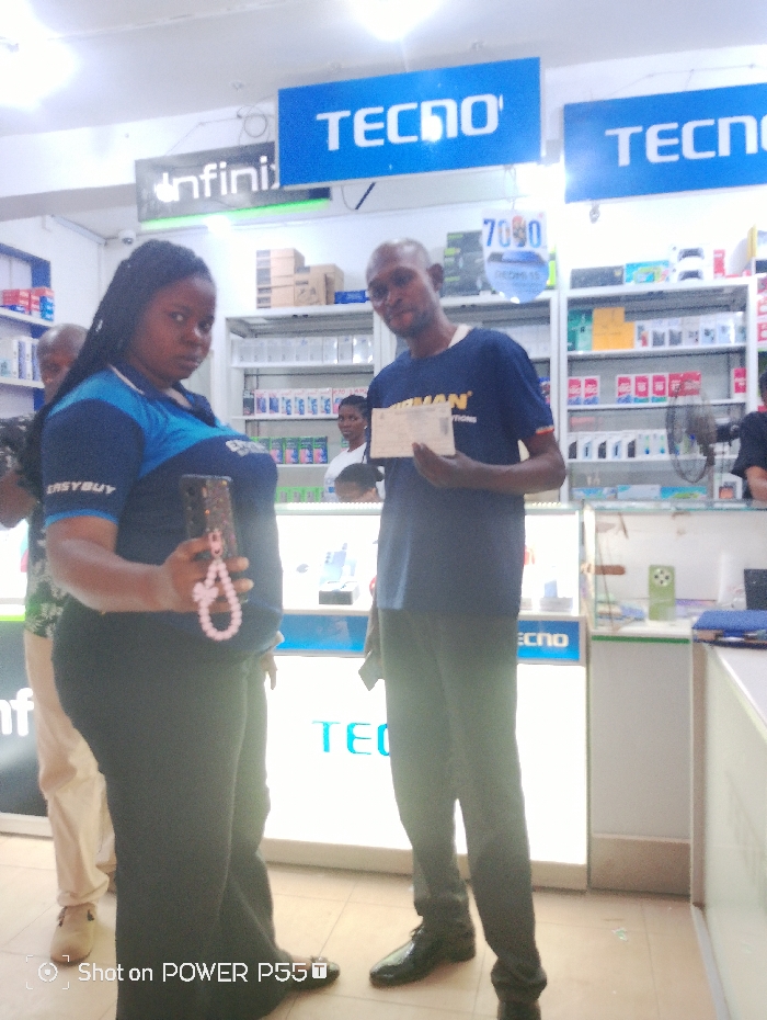 The image displays an interior scene of a mobile phone retail store located in Ado, Nigeria. Two adult individuals, a female and a male, are positioned in the foreground, facing the camera. The female, on the left, has dark braided hair, wears a blue polo shirt with "EASYBUY" branding, and dark trousers. She holds a smartphone with a pink beaded strap in her right hand. The male, on the right, is bald, wears a dark blue t-shirt with "CHIPMAN" branding, dark trousers, and shiny black shoes. He holds a white rectangular document or envelope with both hands. Both subjects exhibit neutral expressions. In the background, a partial view of a man is visible behind the female on the left. A woman in a white shirt stands further back behind the central male, and another individual is partially visible on the far right. The store's environment features white shelving units stocked with mobile phone boxes and accessories. Illuminated blue signs prominently display "TECNO" overhead and on lower display cases, with an "infinix" sign also present. A hanging display on the right includes a price tag marked "7090." The floor is tiled with a light color.