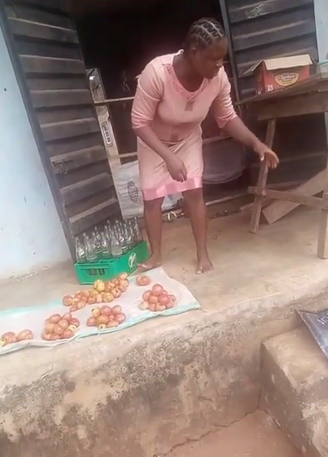 A woman stands on a concrete step in front of a shop. She is wearing a light pink dress with short sleeves and braided hair. In front of her on a white cloth are several piles of red, round objects resembling tomatoes. To the left is a green crate filled with glass bottles. To the right is a crude wooden table with a cardboard box on it. The woman picks up a black plastic bag and appears to be shaking something out of it onto the concrete. The shop behind her has a dark, slatted door that is partially open, revealing a cluttered interior. The environment appears to be an outdoor space adjacent to a building, with hints of greenery in the background.