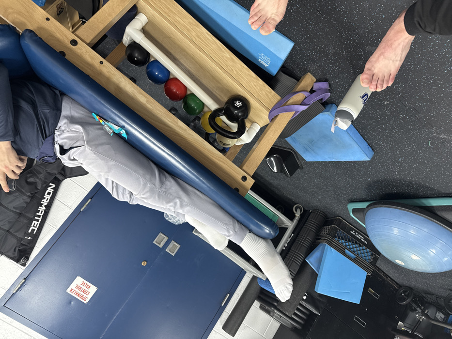 A cluttered gym floor displays various exercise equipment. A blue door with a "Sprinkler Control Valve" sign is partially visible. A wooden rack holds colorful balls and a kettlebell. There's a blue bolster, foam rollers, a BOSU ball, and blue foam blocks. Two bare feet are near a blue foam block and a water bottle, suggesting someone is exercising in the messy space. A Normatec bag is also present.