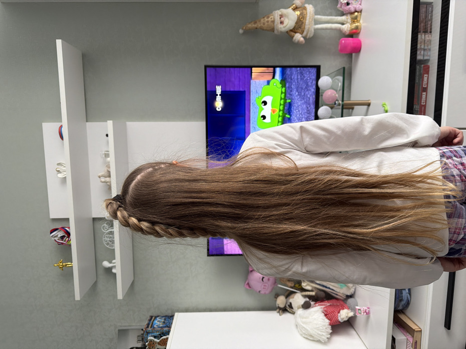 The image depicts the interior of a residential living space in Moscow, Russia. A young person, seen from the back, is the primary subject, standing centrally in the frame, facing a television. This individual has long, light brown hair, with a portion of the top hair braided into a single plait that extends down the crown. The remaining hair flows freely down their back, past their shoulders. They are wearing a long-sleeved, plain white shirt and plaid pajama bottoms. The subject is positioned in front of a modern flat-screen television displaying a children's cartoon featuring a bright green, stylized character. The upper left corner of the screen displays the "СОЛНЦЕ" (SOLNTSE) channel logo. The television is situated on a white entertainment unit or cabinet, which has visible storage compartments below the screen, some containing books with Russian titles like "СТЕНКА" (Wall) and "СТЕНЫ" (Walls). The room's walls are painted a light, muted green. Above the television, two white floating shelves are mounted on the wall. The top shelf displays a small golden statuette resembling an Oscar award, a medal with a red, white, and blue ribbon, and a translucent figurine. The lower shelf holds several small, white decorative items. To the left of the television setup, a tall white cabinet or wardrobe is partially visible, with a blue patterned box and a small tiger figurine on top. A pink pig-shaped balloon or plush toy and other plush toys, including one with white hair and a red base, are arranged on the entertainment unit to the left of the TV. To the right of the television, a tall, decorative Santa Claus figure with a golden, sequined outfit stands next to a small glass-topped table holding two round decorative balls, one pink and one white. A bright pink container is also visible on the entertainment unit.