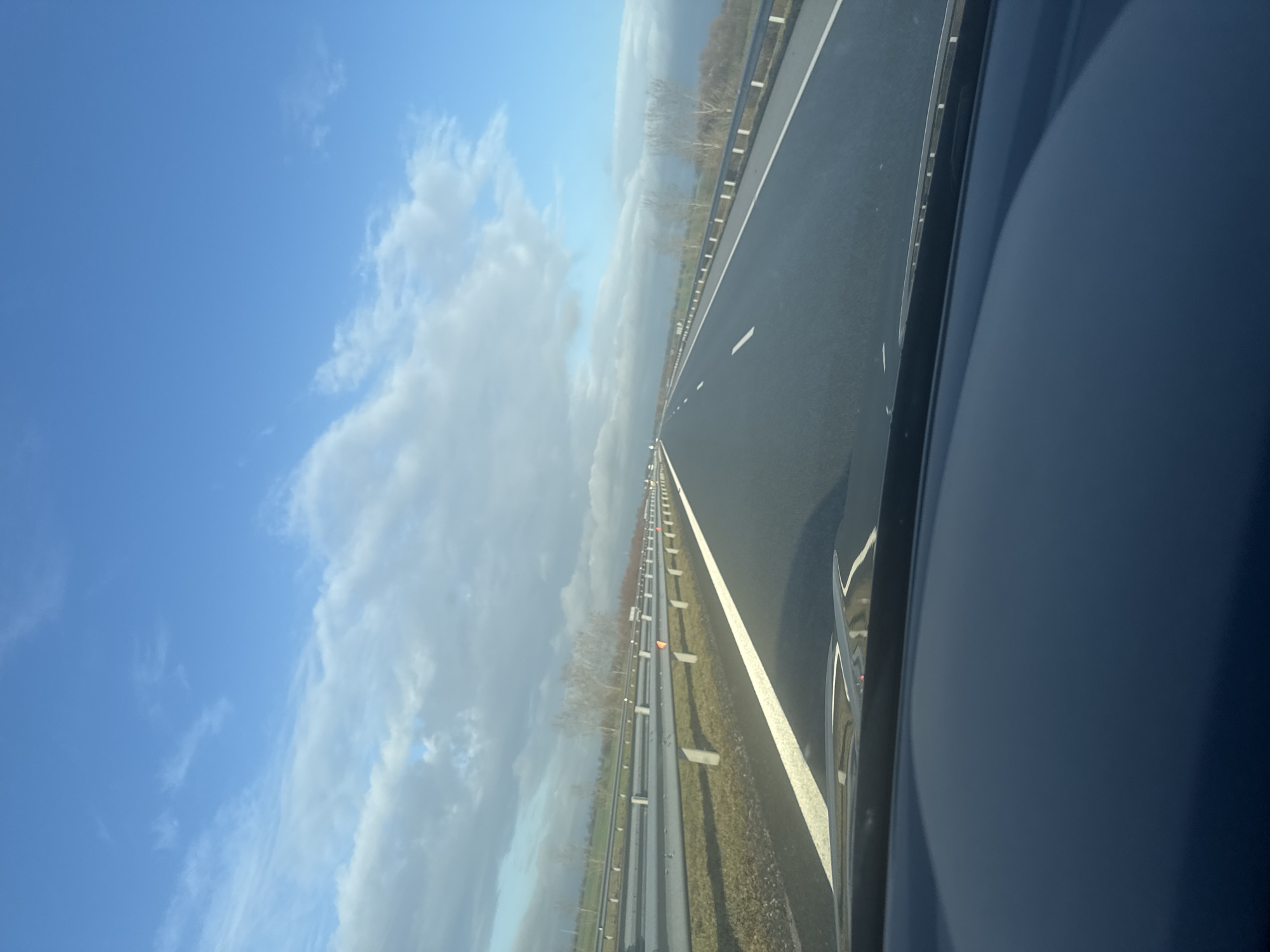 The image displays a forward-facing view of a multi-lane asphalt highway, observed from the interior of a moving vehicle, located near Воденичане, Bulgaria. The road surface, appearing dark and reflective in sections, extends linearly towards the horizon under a sky characterized by a mix of blue patches and scattered white to grey cumulus clouds. The lower portion of the image shows the dark dashboard and the base of the windshield of the photographing vehicle. The highway's rightmost lane is delineated by a continuous solid white line, while dashed white lines mark additional lanes further down the road. Parallel to the highway, on both sides, run metallic guardrails; the right-side guardrail is more prominent and features multiple orange rectangular reflectors. Beyond the guardrails, the landscape comprises grassy verges and fields, punctuated by clusters of bare deciduous trees. No human figures or other active subjects are discernible within the frame.