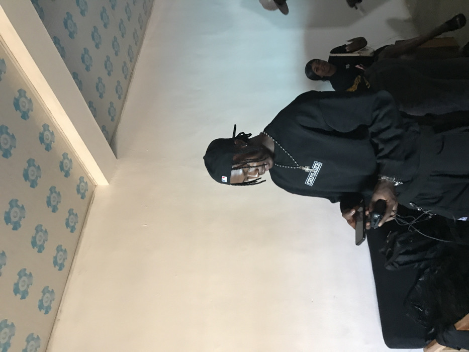 The scene is an indoor setting located in Jos, Nigeria. The room features light-colored walls and a white ceiling adorned with a repeating pattern of light blue floral or star-shaped motifs. A young Black male stands prominently in the center-left foreground, looking down at objects held in his hands. He wears a black long-sleeved sweatshirt with "CRUSADER" printed in a white rectangular box on the chest, black trousers, and a black baseball cap worn backward, featuring a white "NY" logo. A silver-colored beaded chain with a crucifix pendant is visible around his neck, along with multiple silver-colored bracelets on his wrists. He holds a black smartphone in his left hand and a black handheld gaming controller in his right. Behind him to the left, a dark-colored sofa or bench is visible, with a black backpack resting upon it. On the right side of the frame, a young Black female is partially visible, seated, wearing a dark top and holding a white shoulder bag. She has dark hair and a slight smile. A third individual, identified by a partial view of a hat, is visible on the far right edge of the image.
