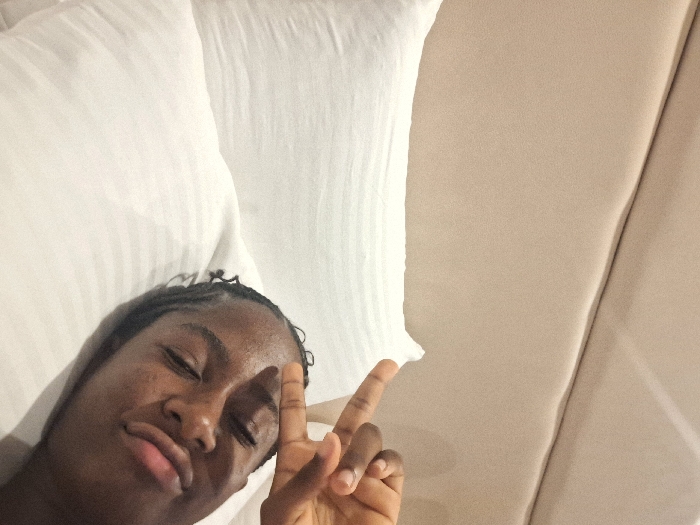 An individual with dark skin and braided hair is partially visible, lying on a white pillow with subtle stripe patterns