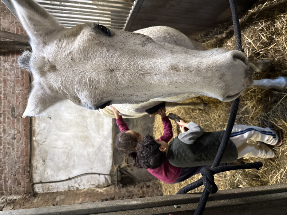 The image depicts an indoor stable environment located in Estaimpuis, Belgium