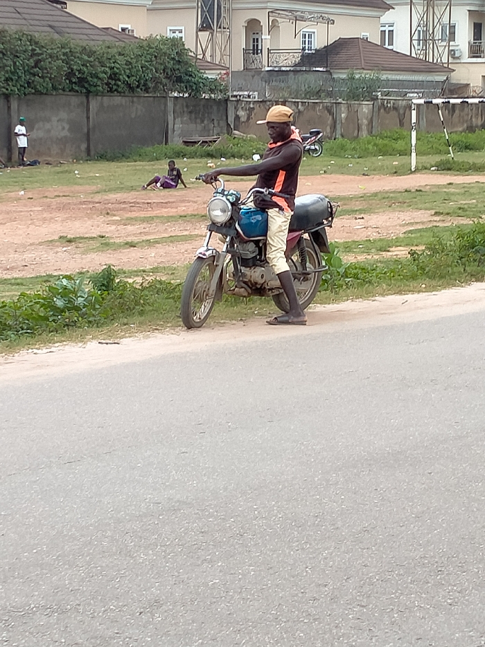 An adult male with dark complexion, wearing a light brown backward baseball cap, a black sleeveless top with orange side panels, light-colored three-quarter trousers, and black flip-flops, is positioned astride an older model motorcycle with a blue fuel tank, his right foot on the ground, on the edge of an asphalt road. The motorcycle is an older, worn model featuring a chrome front fender, a prominent round headlight, and a black seat with a rear rack. Behind the man and motorcycle, separated by a narrow strip of dirt and sparse green vegetation, is a large, irregularly shaped dirt field with scattered patches of green grass. In the far-left portion of the field, a person in a white top and green cap stands near a low object. Further into the field, another individual in dark clothing (possibly purple) is seated on the ground. A distant, small motorcycle is parked in the mid-field. On the right side of the field, a rudimentary goalpost structure, consisting of two white uprights, is visible. A grey concrete block wall runs horizontally across the mid-background, separating the field from a residential area. Behind the wall, several multi-story, modern residential buildings with light-colored facades, multiple windows, balconies, and brown roofs are visible, partially obscured by trees and shrubs. Metal structures, consistent with communication towers or scaffolding, are partially visible behind some of the houses. The foreground consists of a grey asphalt road with no visible markings. The lighting indicates daytime. The scene is located in Gwarinpa, Nigeria, reflecting a mixed urban environment with developed housing and open, undeveloped plots.