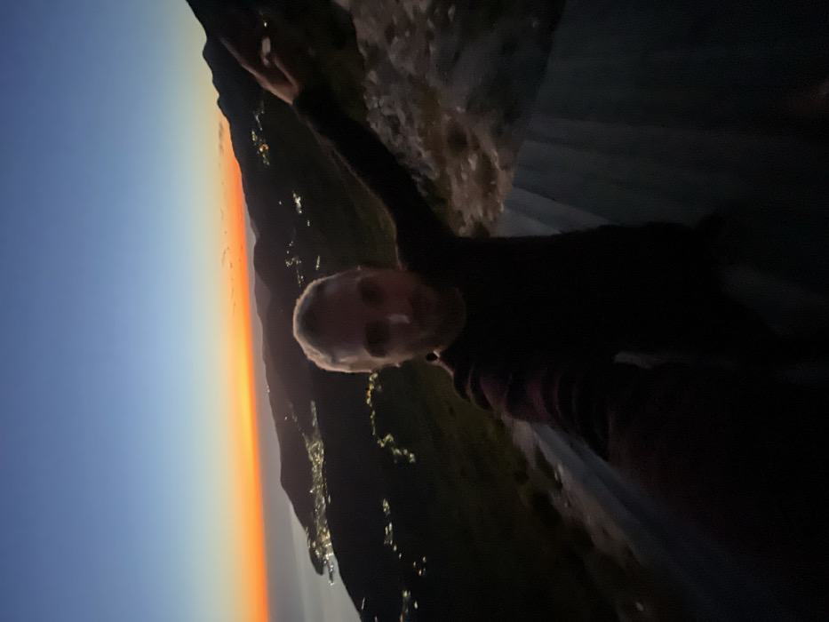 A single male subject is captured in a selfie taken from a high vantage point in Brajici, Montenegro, during twilight. The subject, positioned in the lower central frame, has short, light-colored hair and wears a dark, possibly striped, long-sleeved garment. His left arm extends towards the camera, holding the imaging device, while his right arm extends upwards and to the right with an open hand. In the immediate foreground, a dark, corrugated metal barrier or guardrail extends diagonally from the lower right. The background reveals a panoramic vista of an illuminated coastal urban area below, characterized by numerous artificial lights clustered along the coastline and inland. Beyond this urban area, the dark expanse of the Adriatic Sea is visible to the left. The sky transitions from a deep blue overhead to a vibrant orange and red band along the horizon, consistent with sunset or sunrise conditions. Dark, undeveloped mountainous terrain flanks the illuminated urban area in the mid-ground and background.