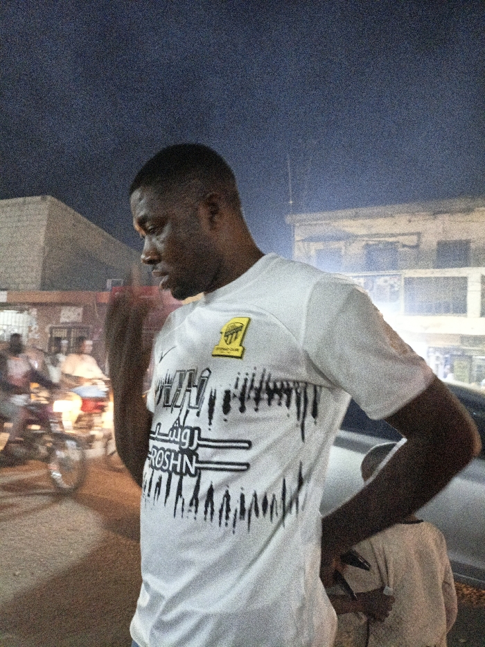 A man stands outdoors at night, wearing a white soccer jersey with black graphics and a yellow patch, likely a team logo. The jersey features the word "ROSHN" in bold letters. He is facing left with his head slightly bowed. In the blurred background, there are buildings, people, and motorbikes, suggesting a street scene. A person in a light-colored shirt stands to his right, partially obscured. The overall image appears to be captured in a low-light environment.