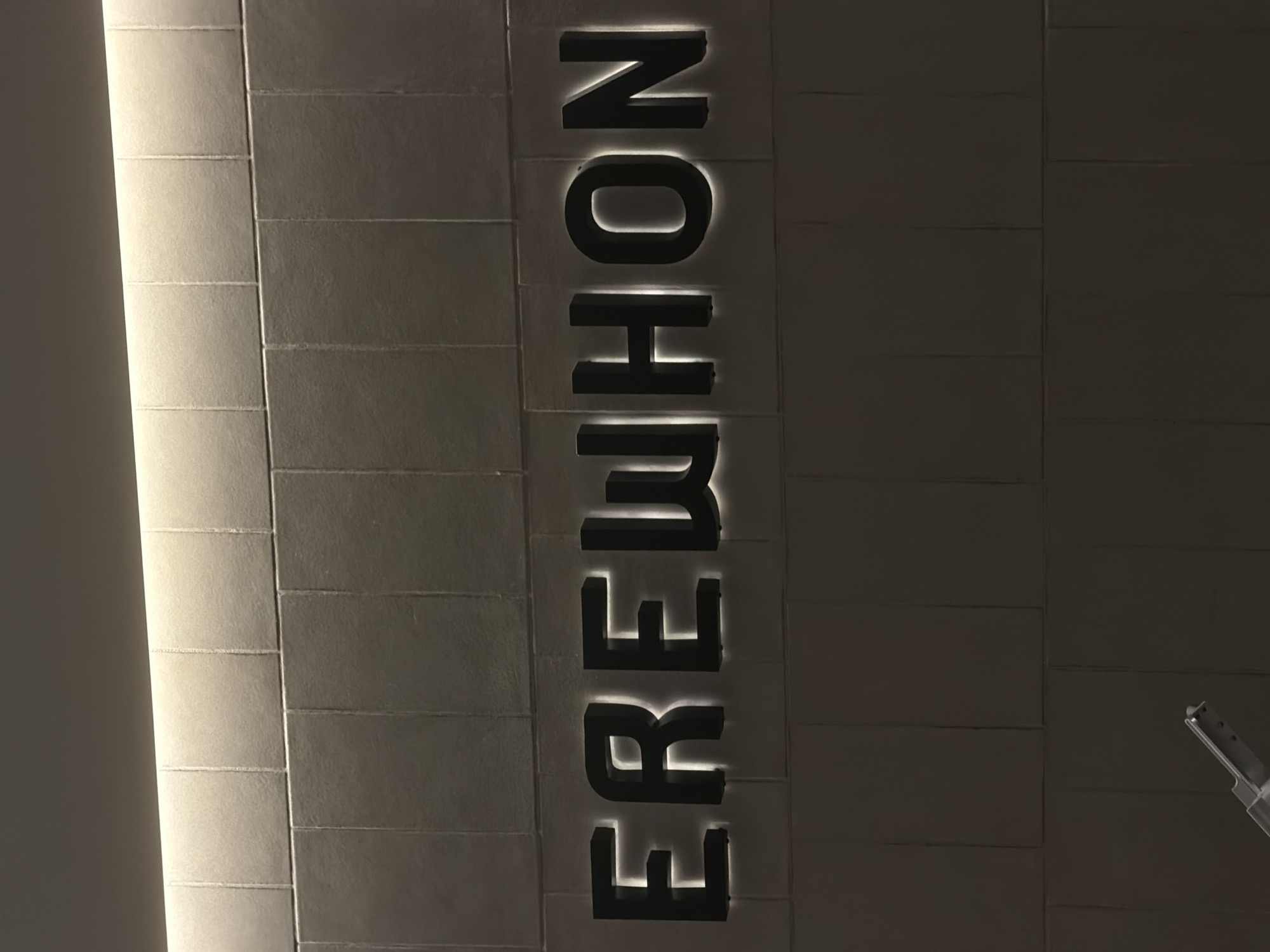The image depicts a wall with the vertically spelled, illuminated word "FREMONT" in black capital letters. The wall consists of horizontally stacked, rectangular tiles with slightly textured surfaces. The lighting casts a bright glow around the letters, enhancing their visibility. The location is in West Hollywood, California, evidenced by the store name "Fremont" which is a retail store in the city.