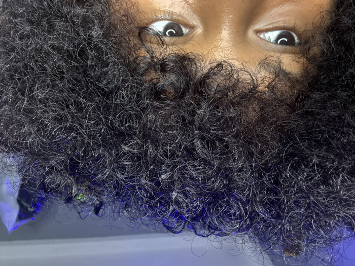 The image displays a close-up, frontal view of an individual's face, focusing on the eyes and the upper portion of the head. The subject possesses dark skin and dark, densely curly hair, forming a voluminous texture that obscures the forehead and sides of the face. Both eyes are open, with a direct gaze towards the viewer. Reflections of a crescent-shaped light source are visible within the pupils of both eyes. The skin immediately around the eyes appears smooth with a slight sheen. The background is out of focus, exhibiting a blue-purple hue, indicative of artificial lighting. The specific location within Ado, Nigeria, cannot be determined from the visual evidence provided. No other individuals, objects, or actions are discernible within the frame.