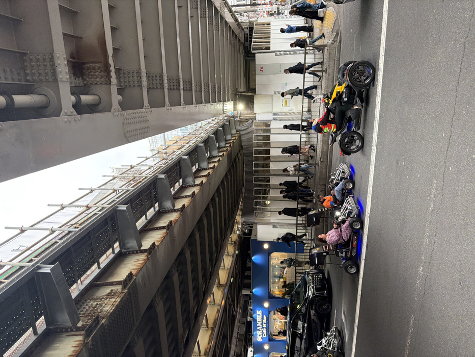An outdoor urban scene in Shibuya, Japan, captured during daylight hours, positioned beneath multiple layers of elevated railway or highway infrastructure. The overhead structure consists of heavy steel girders, beams, and rivets, exhibiting visible rust and industrial design elements. Scaffolding is present on the upper section of the leftmost elevated structure. The foreground depicts a gray asphalt roadway. Three recreational vehicles are in motion from left to right: 1. A blue go-kart, driven by an adult female wearing a pink patterned outfit, features blue underglow lighting and the number "15" on its side. 2. A silver go-kart, driven by an adult male wearing an orange shirt, is positioned behind the blue go-kart. 3. A black and yellow three-wheeled motorcycle (Can-Am Spyder style), driven by an individual wearing a multi-colored jacket (red, blue, yellow), is to the right of the go-karts. A black minivan, identified as a Toyota Alphard or similar, is partially visible on the far left, behind the first go-kart. On the left side of the street, a modern building facade is visible, featuring a prominent illuminated blue sign that reads "SCRAMBLE Cafe & Bar" in white text. Numerous pedestrians are walking on the concrete sidewalk, which runs parallel to the street. These individuals are casually dressed and appear to be moving in various directions. On the right side of the scene, behind the pedestrians, a series of white construction hoardings with wooden framing are erected, displaying the letters "JV" on one panel. The sky above, visible between the elevated structures, is overcast and light gray.