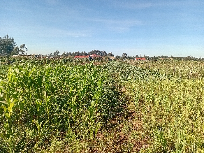 A vibrant landscape presents diverse crops under a blue sky. Lush green corn stalks fill the foreground, transitioning to a field of low-lying, leafy plants. Beyond, a denser, yellowish crop stretches towards the horizon, punctuated by scattered trees and a few houses with red roofs. The overall impression is that of a fertile agricultural landscape.