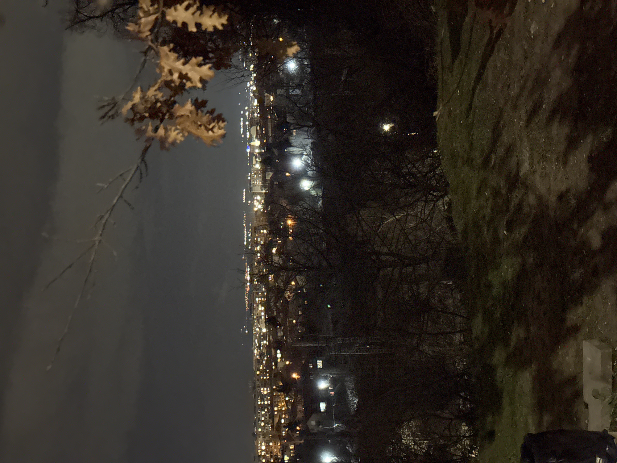 The image presents a nighttime panoramic view of Sofia, Bulgaria, captured from an elevated position, consistent with a viewpoint from the foothills of Vitosha Mountain, looking over the urban sprawl. The sky overhead is dark and overcast. In the upper-right quadrant, a branch from a deciduous tree is visible in the foreground, featuring clusters of dried, brown, possibly oak, leaves. The ground in the lower foreground is dark and uneven, characterized by patches of bare soil and sparse, dimly illuminated green grass. A dark, indistinct object, possibly a bag, rests on the ground in the bottom-left corner, adjacent to a light-colored, rectangular concrete block. The midground is densely vegetated with leafless deciduous trees and shrubs, obscuring the immediate urban structures. Several distinct, bright artificial light sources are visible within this wooded area, along with the silhouette of a tall, slender structure, likely a communication or power mast. The background reveals the extensive cityscape of Sofia at night. Thousands of illuminated windows and streetlights create a dense pattern of yellow and white light across the horizon, indicating a vast urban environment comprising numerous residential and commercial buildings. No individuals or specific actions are discernible in the scene.