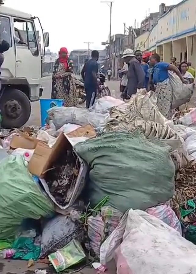 large pile of garbage bags and loose debris in a street in what appears to be a city. A truck is parked nearby, and several people are seen loading garbage into the back of the truck from a large red bucket. People are walking nearby. The environment appears to be a bustling urban area.