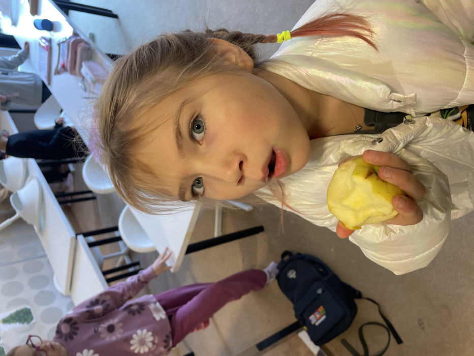 A young girl with blonde hair in pigtails, secured with a yellow band, holds a half-eaten pear. She wears a white iridescent puffer jacket. Her blue-grey eyes look at the camera with a slightly open mouth. A blue backpack sits on the floor next to her. In the background, other people are sitting at tables, and a girl in a purple floral shirt and leggings is visible. The scene appears to be indoors, possibly a school or classroom.