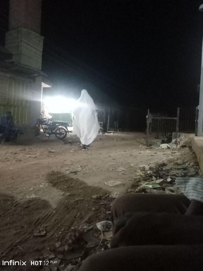 At night, a figure draped in white cloth stands in a dimly lit street. Behind them, a motorcycle is parked near a building. Trash is scattered along the right side of the street, and a fence is visible in the background. The foreground shows what appears to be a set of cushions or large dark bags. The overall scene is dimly lit.
