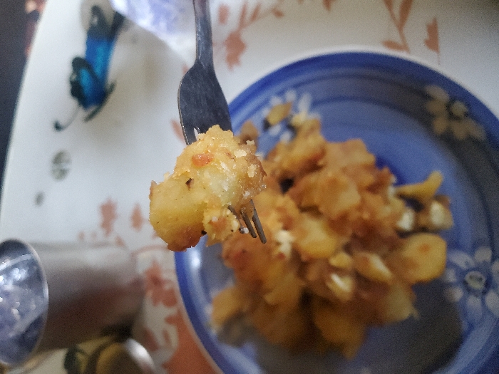 - "A close-up image depicts a metal fork lifting a piece of fried potato from a blue and white ceramic plate" by FM-0HFZ43, licensed under CC BY 4.0