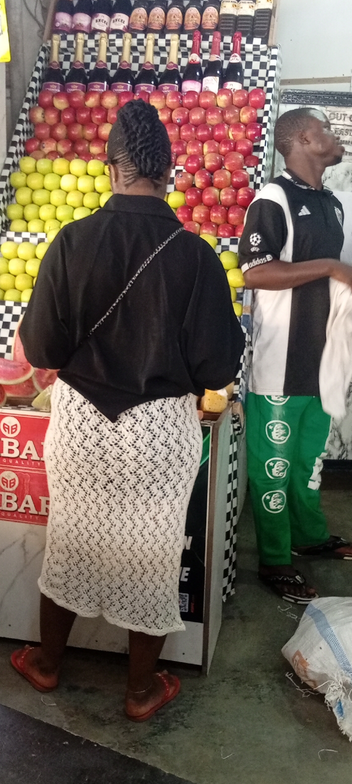 The scene depicts an interior view of a retail establishment or provision store in Aviation Quarters, Nigeria. Two individuals are present near a multi-tiered produce and beverage display. In the foreground, a female subject is viewed from the rear. She has dark skin, and her hair is styled in tight, upward-braided cornrows. She wears a black short-sleeved top and a white, knee-length crocheted skirt with a diamond pattern. A thin, silvery chain-like strap crosses her back. On her feet are red open-toed sandals, and a thin anklet is visible on her right ankle. She stands facing the display, appearing to examine the goods. To the right, a male subject stands in profile, facing right. He has short, dark hair and dark skin. His attire consists of a black-and-white vertically striped short-sleeved shirt, which features an Adidas logo and a football graphic on the left sleeve. He wears green trousers with multiple white circular emblems. His footwear comprises dark flip-flops. He holds a folded white cloth in his right hand and gazes upwards and to his right. The central feature is a multi-tiered display unit with black and white checkered sides. The top shelves hold numerous bottles, some labeled "EXCEL" and "CHANDOON," containing various beverages. Below these, multiple rows of red apples are meticulously stacked, followed by a lower tier of green/yellow apples. To the lower left, slices of watermelon are visible on a separate counter. Adjacent to the female's right hip, a yellow sponge or small fruit rests on a surface. A partially visible red sign with white text, "AB QUALITY BAR," is located on the lower left. The floor is a gray, possibly concrete, surface, with a white woven sack featuring blue stripes visible on the right side.
