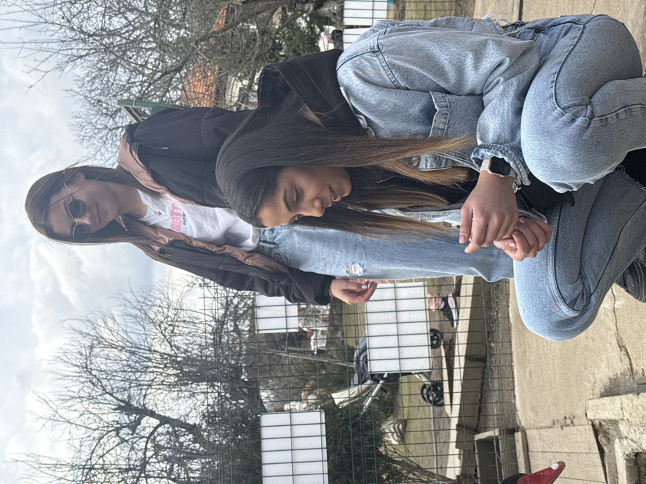 The image depicts two females outdoors in Leskovets, Bulgaria, under an overcast sky
